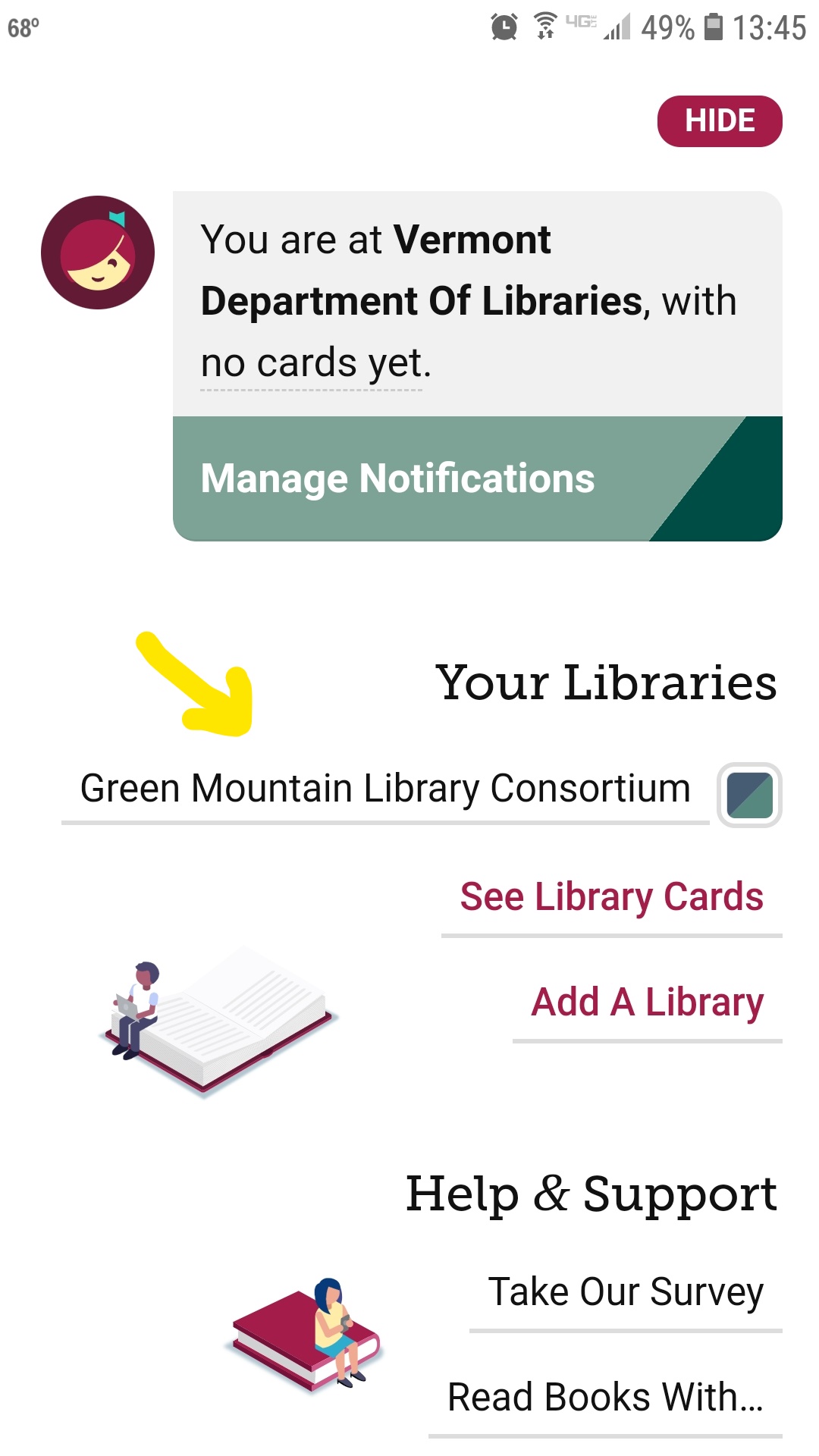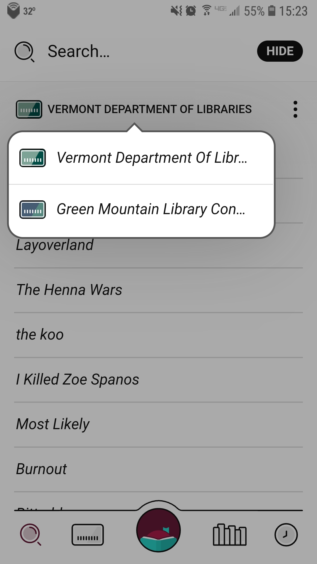 To switch back to the Green Mountain Library Consortium on Libby select that small round icon in the top right again, and then select “Green Mountain Library Consortium”.